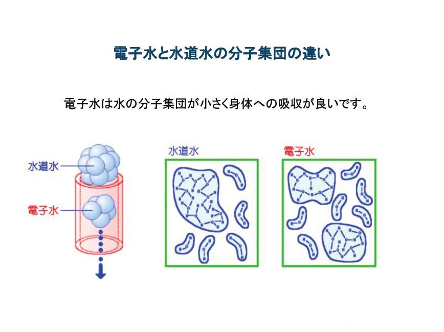 ・電子水は長期間酸化しない水です。そして水の分子集団(クラスター)が小さくて細胞膜を浸透する水です。