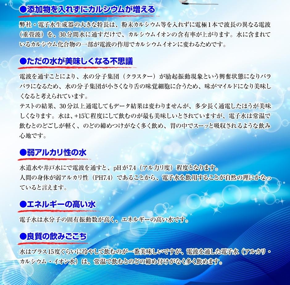 ・電子水は長期間酸化しない水です。そして水の分子集団(クラスター)が小さくて細胞膜を浸透する水です。まろやかで、のど越しの良い美味しい水です。